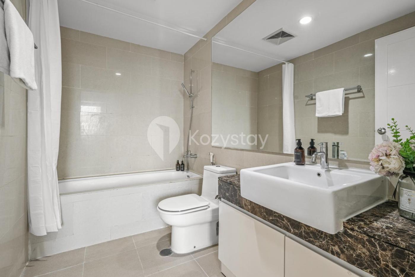 Two-Bedroom Apartment. Guests will have a special experience as this apartment provides a sauna. This spacious apartment is comprised of 1 living room, 2 separate bedrooms and 2 bathrooms with a bath and free toiletries. In the well-fitted kitchen, guests will find a stovetop, a refrigerator, kitchenware and a microwave. The air-conditioned apartment offers a flat-screen TV with streaming services, a washing machine, a seating area, a dining area as well as city views. The unit offers 2 beds.